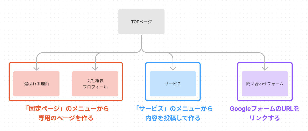 ミニマムなホームページの作りとして、TOPページから「選ばれる理由」「会社概要&代表プロフィール」「サービス」「お問い合わせフォーム」の各ページへアクセスができるような構成を想定しています。
