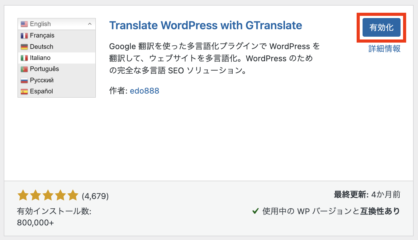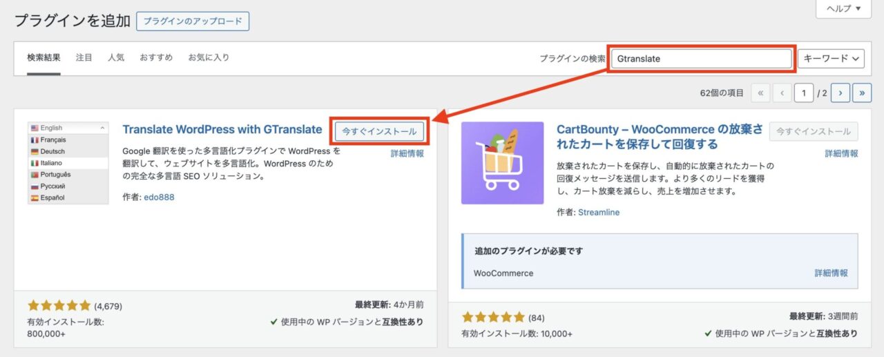 「Gtranslate」と検索し、「今すぐインストール」をクリック