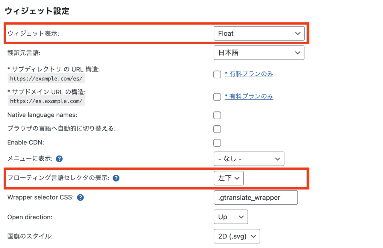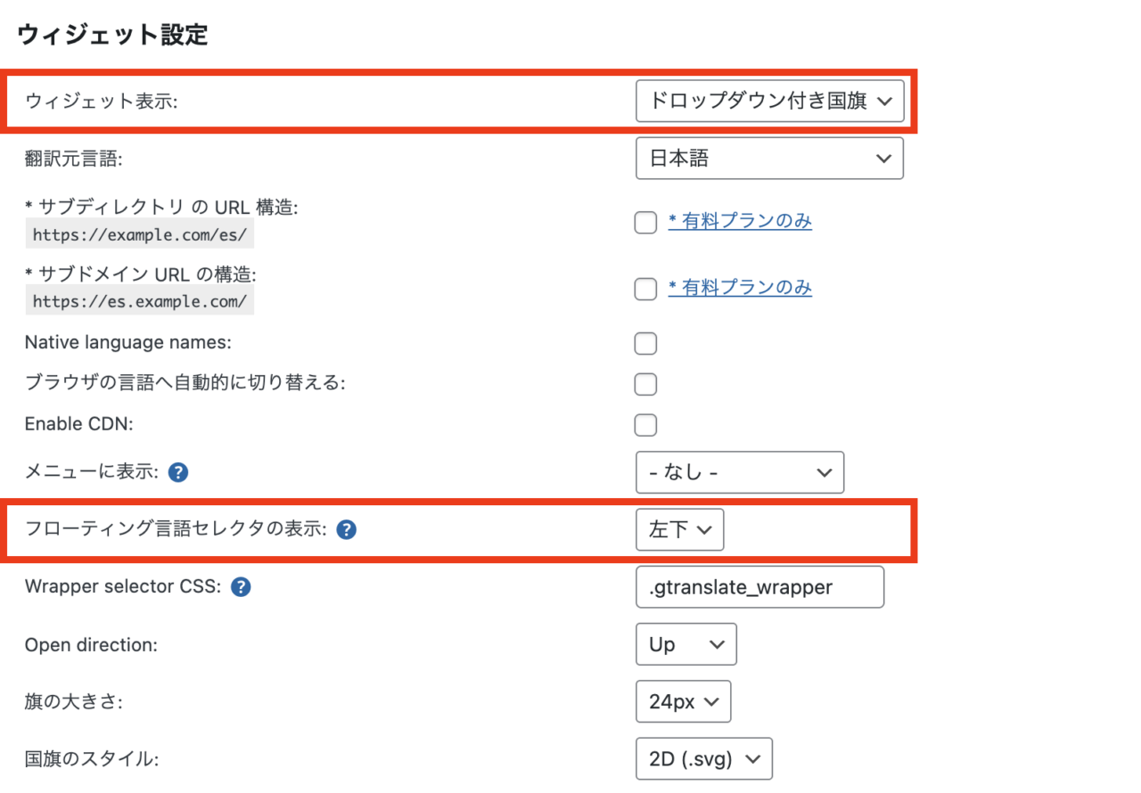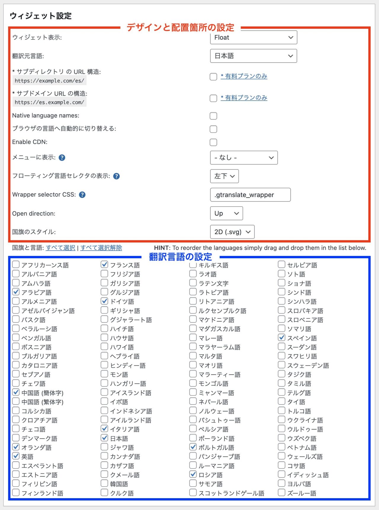 赤枠部分でデザインと表示箇所の設定。青枠部分で翻訳言語の設定をします。